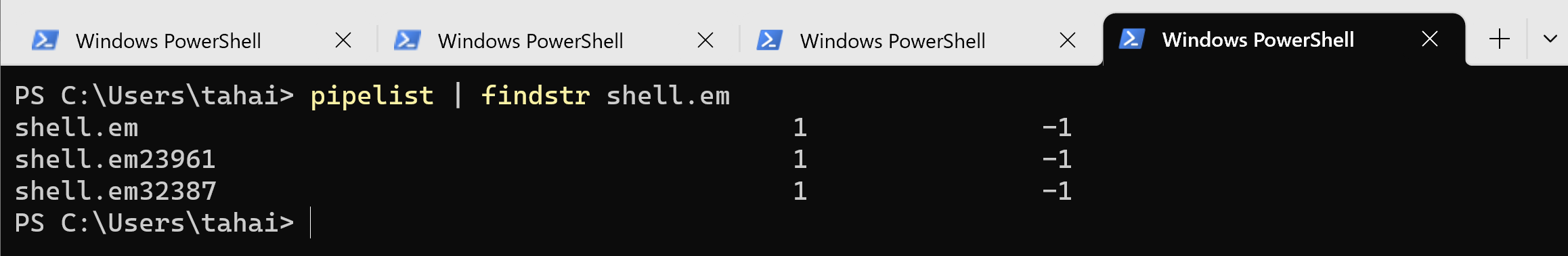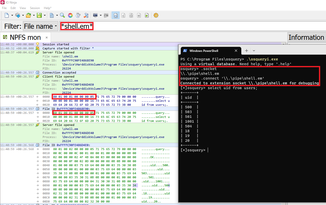 One of the key distinctions between the osquery daemon and shell in the context of IPC is that an instance of the osquery interpreter creates a named pipe with a name containing 'shell.em'. On the other hand, if osquery is run as a service, it creates a named pipe called 'osqueryd.em' as shown below.