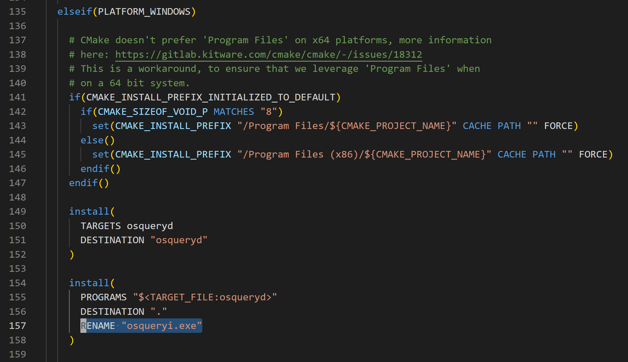 Before delving deeper into the analysis, it is important to note that both binaries are nearly indistinguishable. They share the same source code but exhibit different behaviors based on the binary filename and parameters provided. If you examine osquery/cmake/install_directives.cmake, you will come across the following set of instructions.