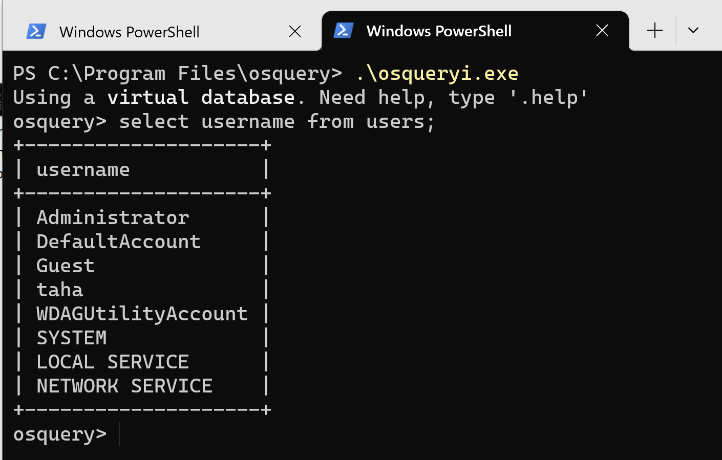 Osquery has powerful built-in tables such as process_memory_map, nrfs_acl_permissions, listening_ports, pipe, ntdomains and many more, moving forward the technique depicted in the screenshot is not ideal because it requires creating a new instance of Osquery for each query. Unlike SQL, this method is unable to handle stacked queries. Although you can utilize join tables with shared columns, it adds complexity and imposes restrictions on the queries you can make.
