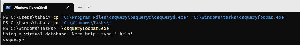 Moreover, if you examine the CMake install directives for MacOS, you will notice that osqueryi is a symbolic link to osqueryd. Furthermore, if you carefully observe the description field of both Windows binaries, you will find the phrase 'osquery daemon and shell.' This reinforces our previous assertion that both binaries can function as either a daemon or a shell. An effortless method to verify this is to create a copy of osqueryd.exe, rename it to a different name, and execute it.